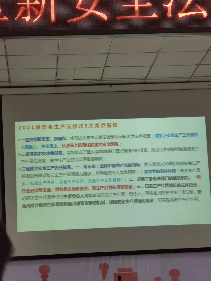 日開展新《安全生產(chǎn)法》知識專題培訓,進一步宣傳貫徹新《安全生產(chǎn)法》的實施,有效落實安全生產(chǎn)職責,提升安全生產(chǎn)防范意識,有效防范和遏制安全生產(chǎn)事故發(fā)生。